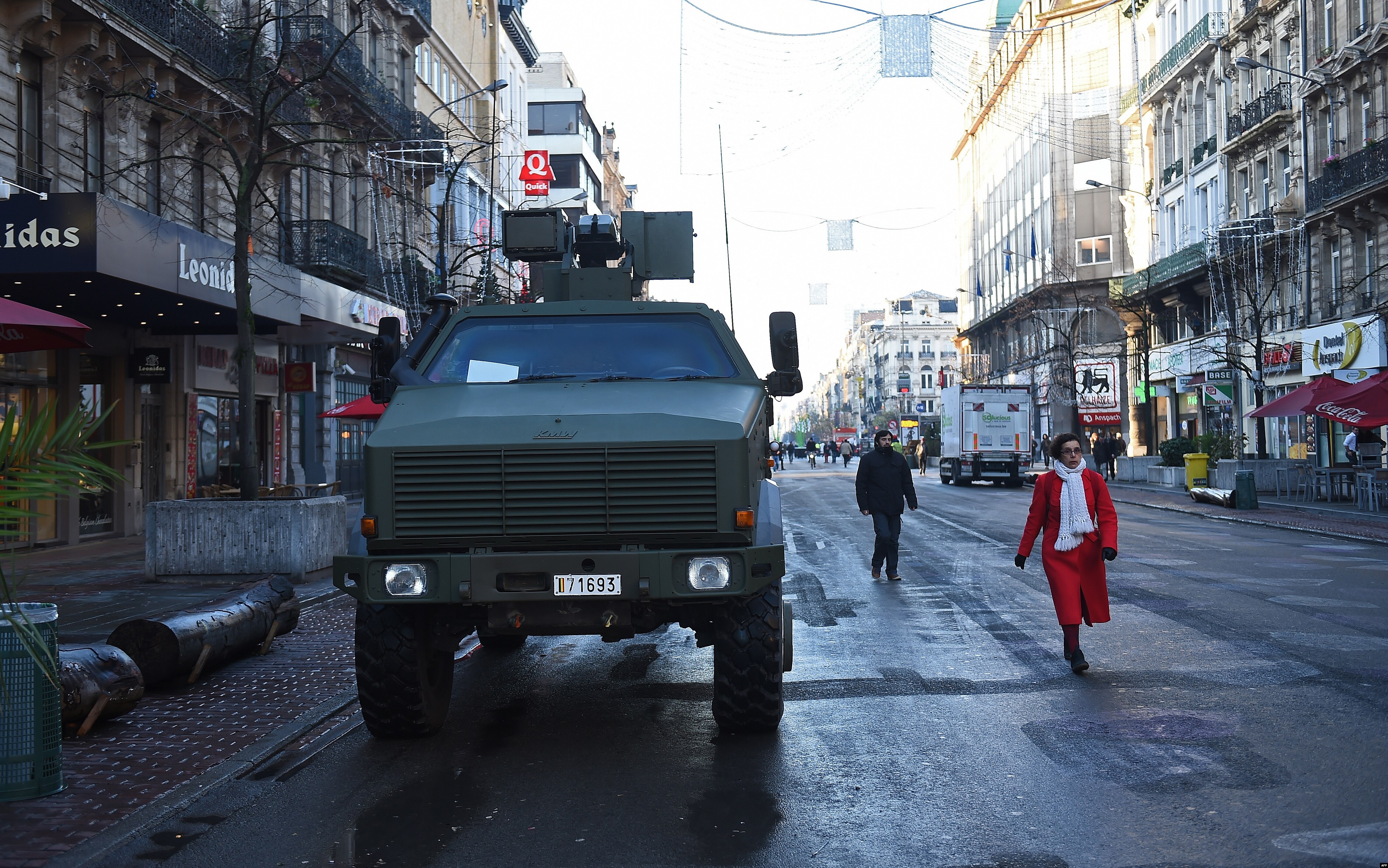 People walk past an armoured personnel carrier in Brussels as the Belgian capital remains on the highest possible alert level.